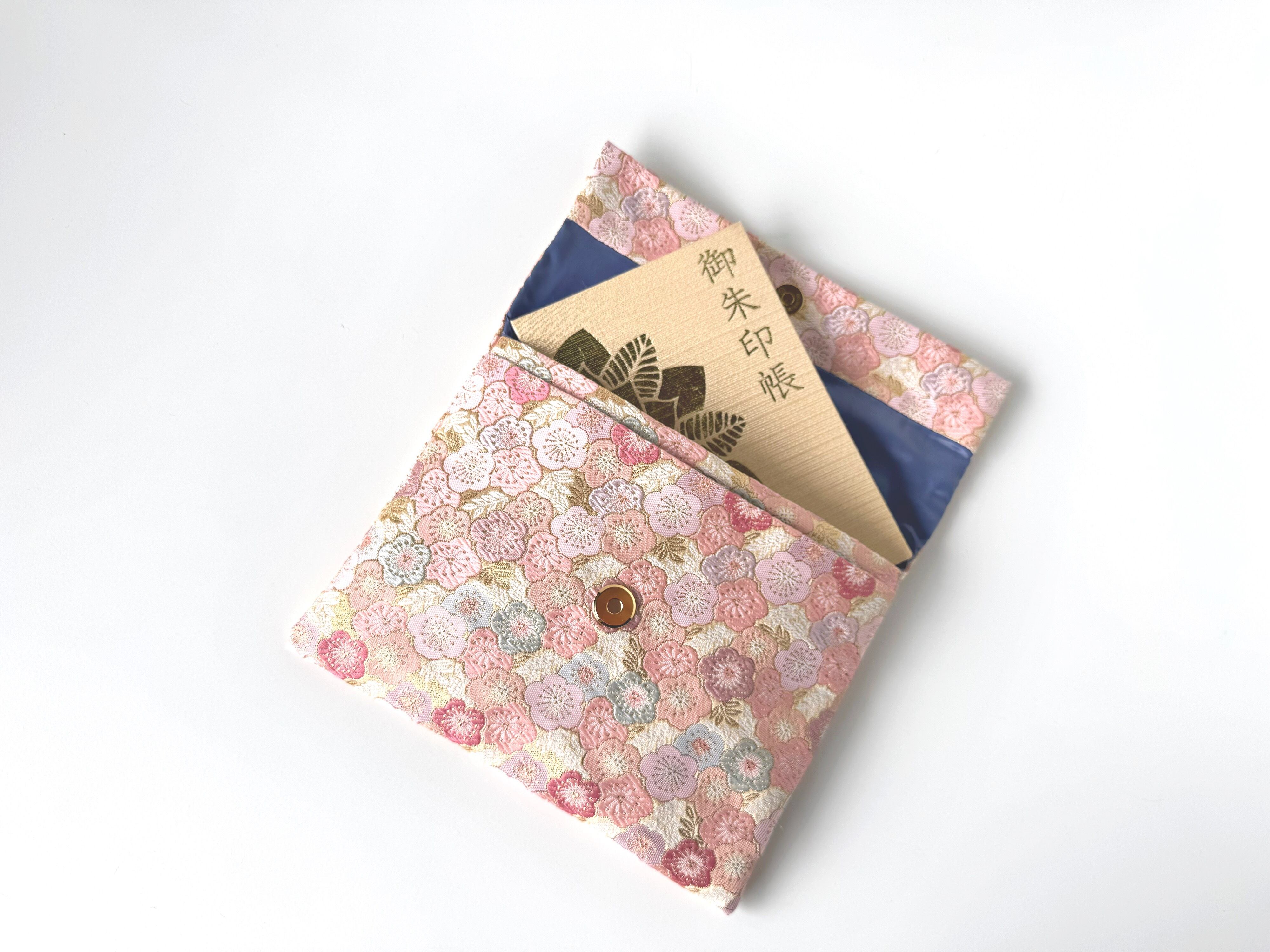 梅がたくさん描かれたとても優しい色合いの可愛らしい御朱印帳入れです。